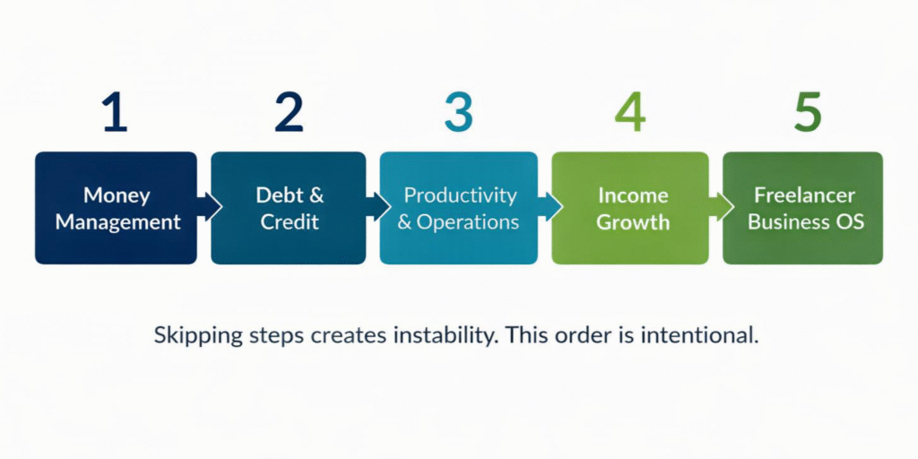 FM Mastery does not provide generic personal finance advice. Instead, it delivers a structured financial operating system composed of sequential systems covering money management, debt and credit optimization, productivity and operations, income growth, and freelancer business systems.